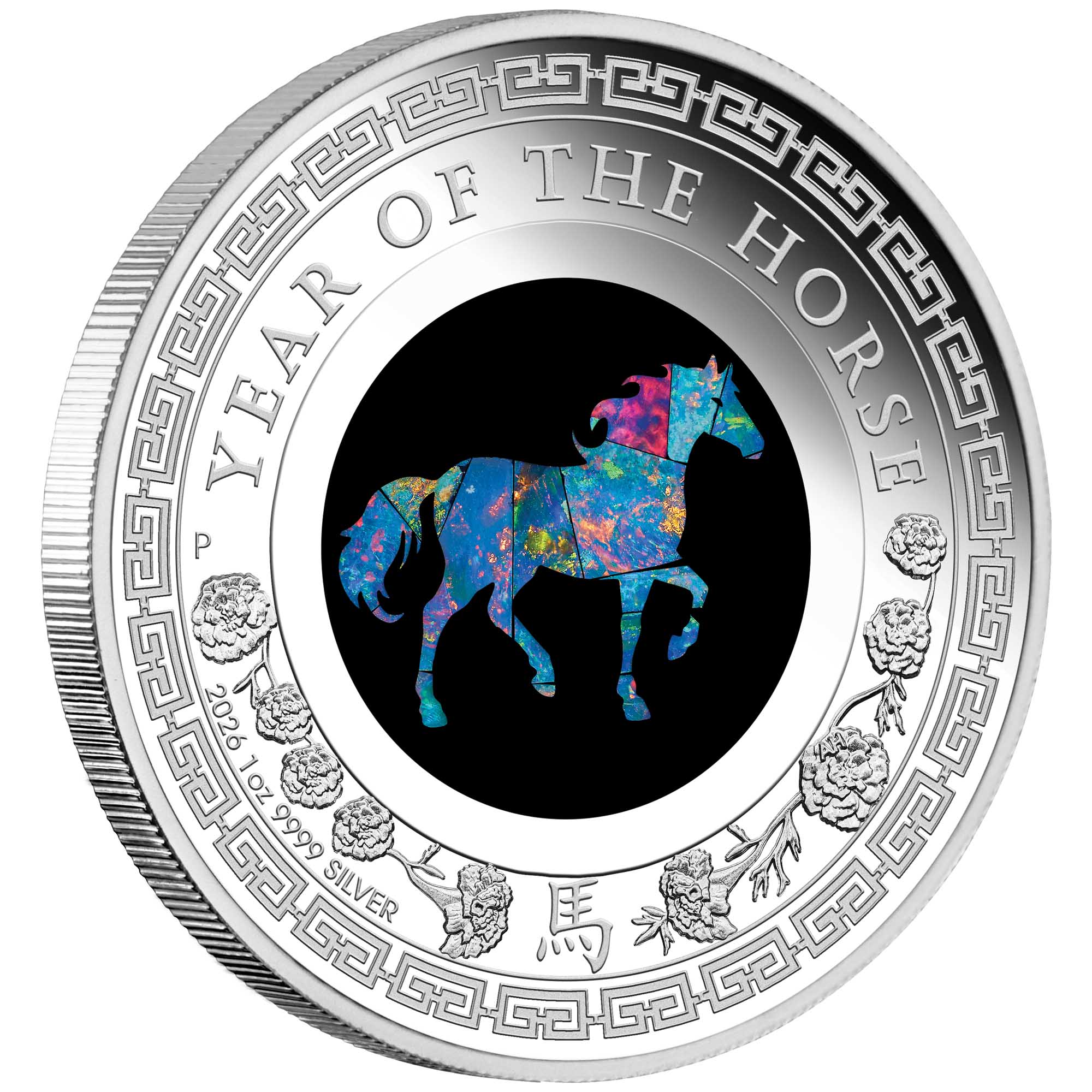 1 Unze Silbermünze Australien 2026 in Polierte Platte - Opal Serie | Motiv: Lunar Serie PFERD
