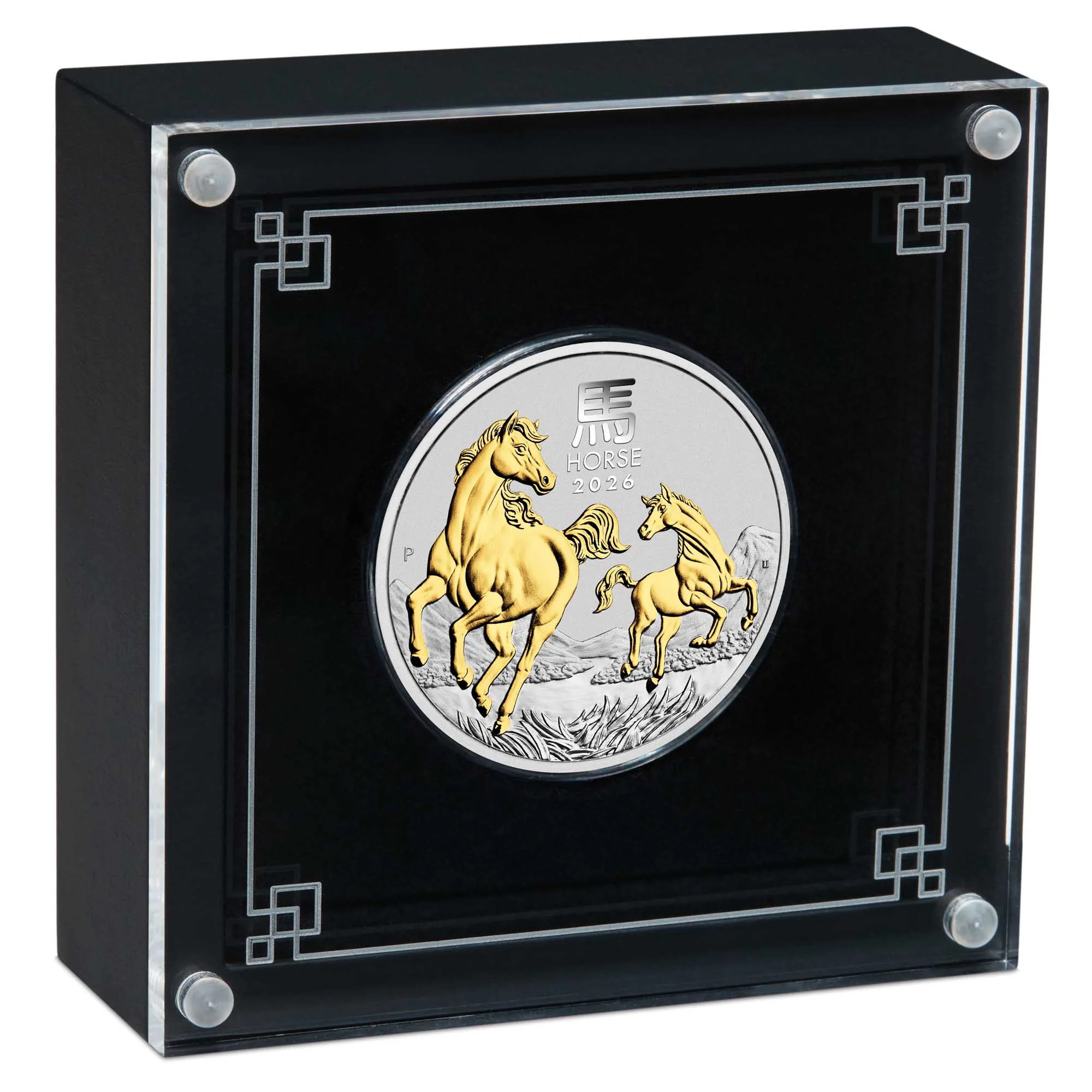 1 Unze Silbermünze Australien 2026 vergoldet im Münzetui - Lunar Serie 3 - Motiv: PFERD ( Perth Mint )